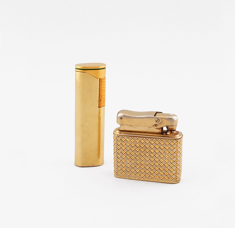 rispettivamente rivestito in oro bicolore con decoro a paglia gr. 19. Il secondo in metallo dorato con profilo superiore in smalto verde firmato Pierre Cardin.