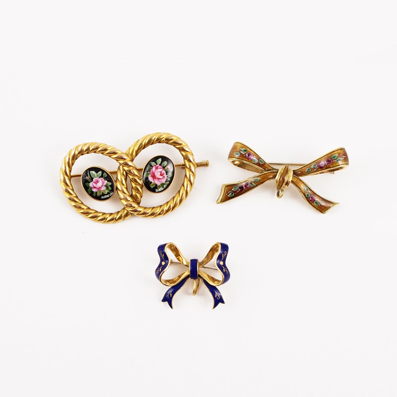 di tre spille in oro giallo con smalti, gr. 29,1.