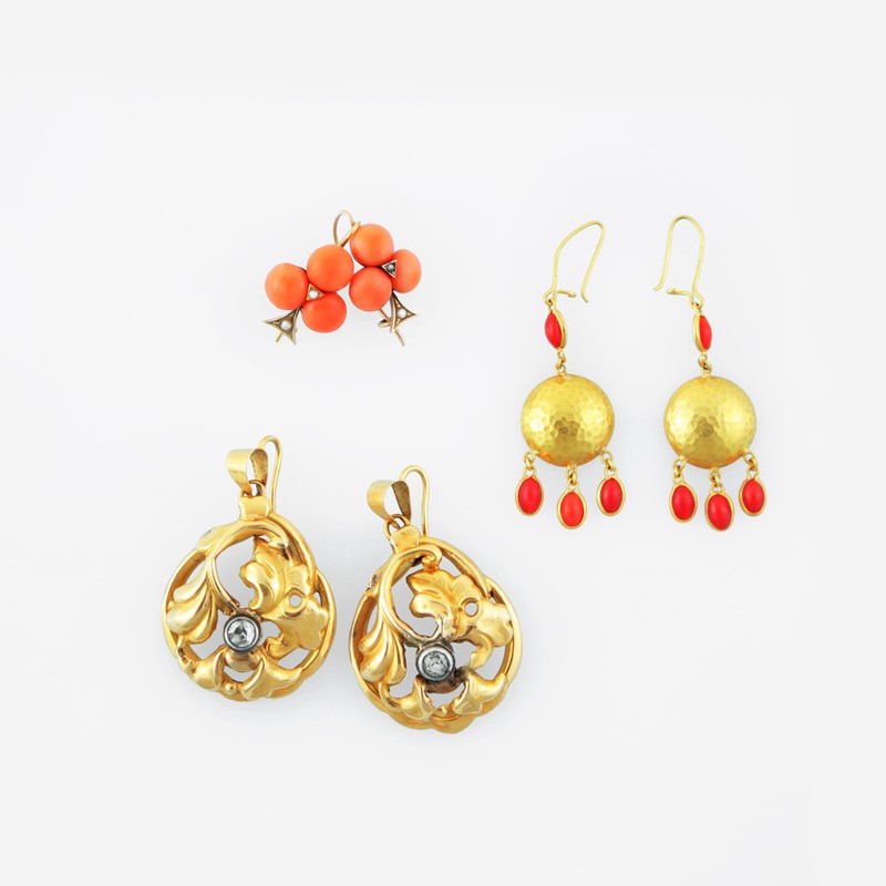 di tre paia di orecchini in oro giallo, con corallo e diamanti (sbeccature), gr. 15,1.