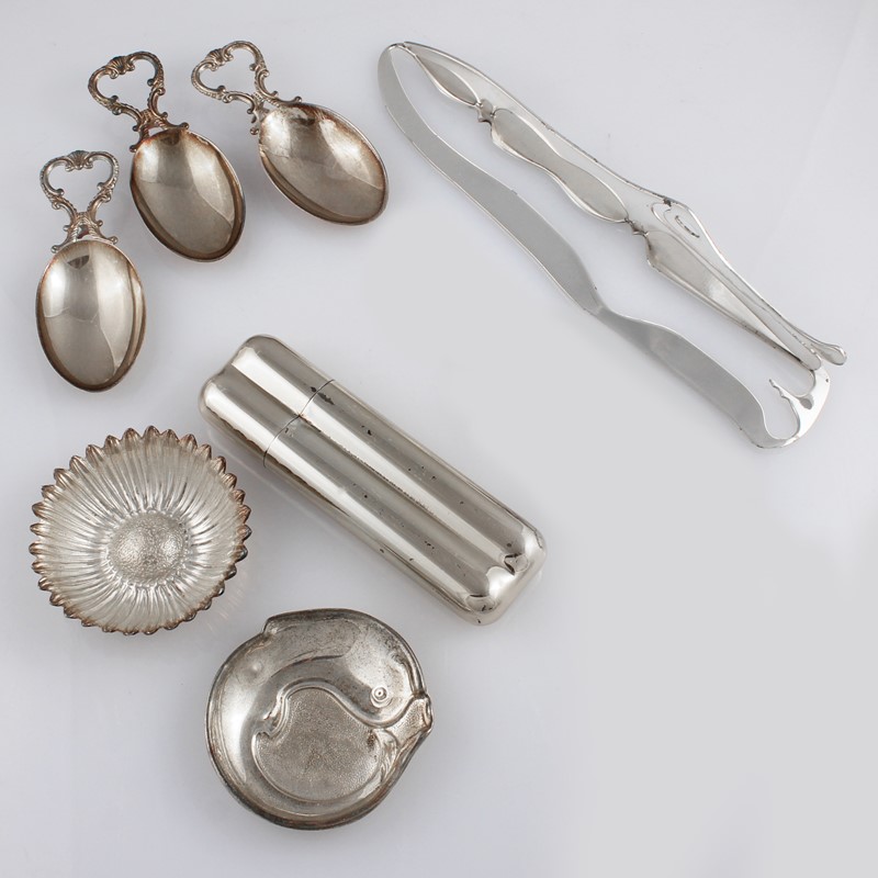 di sette oggetti in argento 925 e 800, di tre cucchiaini, due portaceneri, un portasigari e un fermacarte, gr. 520 ca.