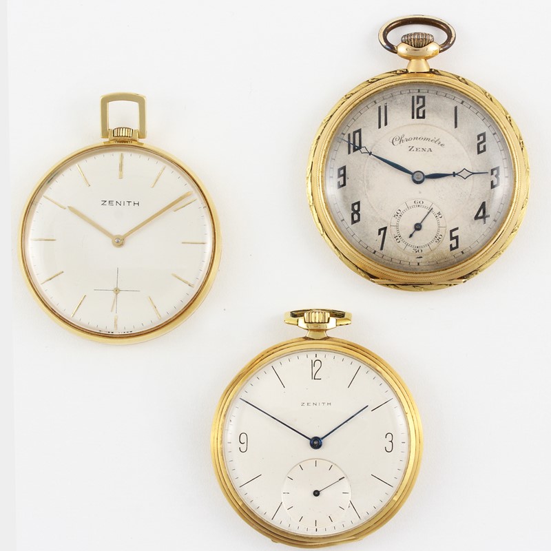 di 3 orologi da tasca in oro giallo 18Kt (due Zenith e uno Zena). Zenith: 45-46 mm, da revisionare Zena: 49 mm (anello di carica in metallo) Peso tot. Gr: 186