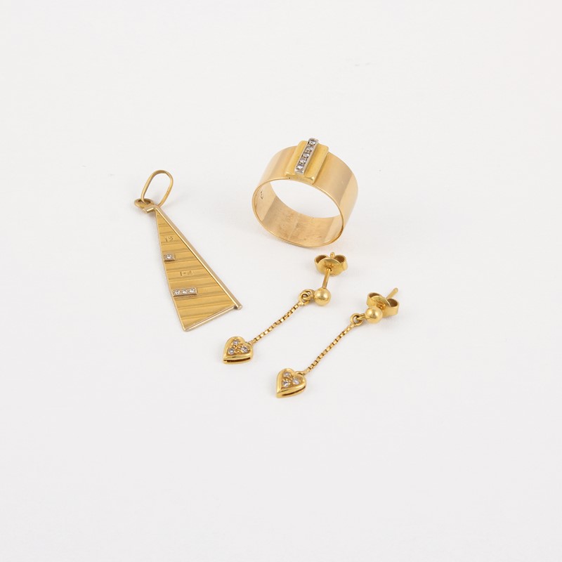 costituito da pendente, anello e orecchini montati in oro giallo e brillanti, gr. 13,1.