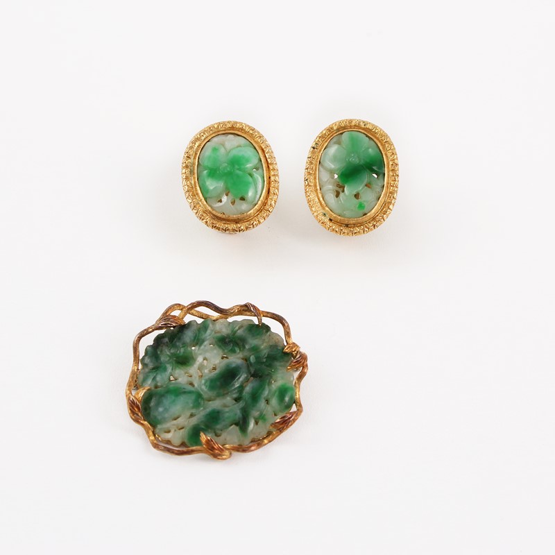 di spilla e orecchini con giadeite incisa a motivi floreali montata in oro giallo, gr. 28,3.