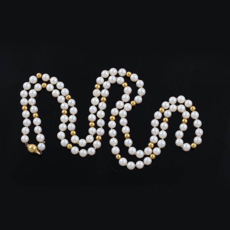 a un filo di perle coltivate, alternate a sfere in oro giallo, 6,9 mm, gr. 51. Lunghezza 87 cm
