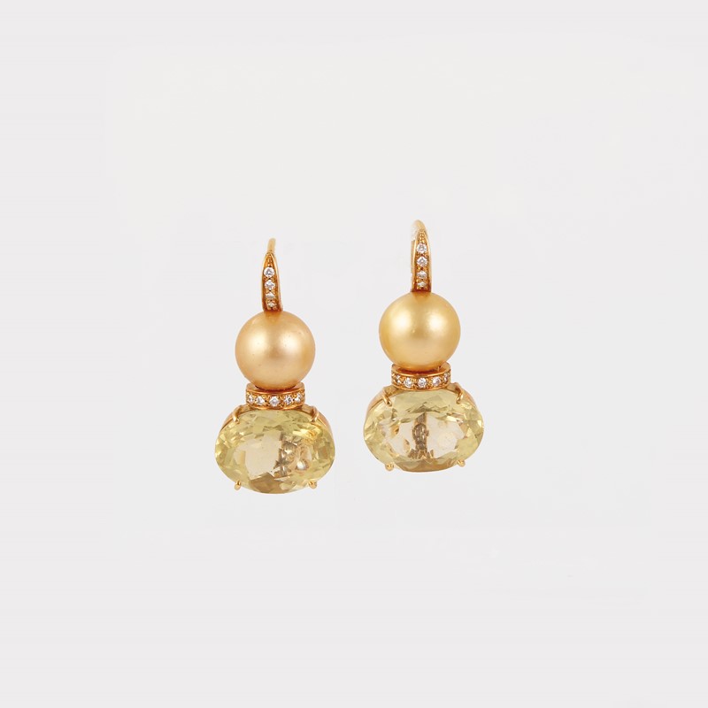in oro giallo con quarzi citrini, brillanti e perle coltivate “gold”, gr. 15.