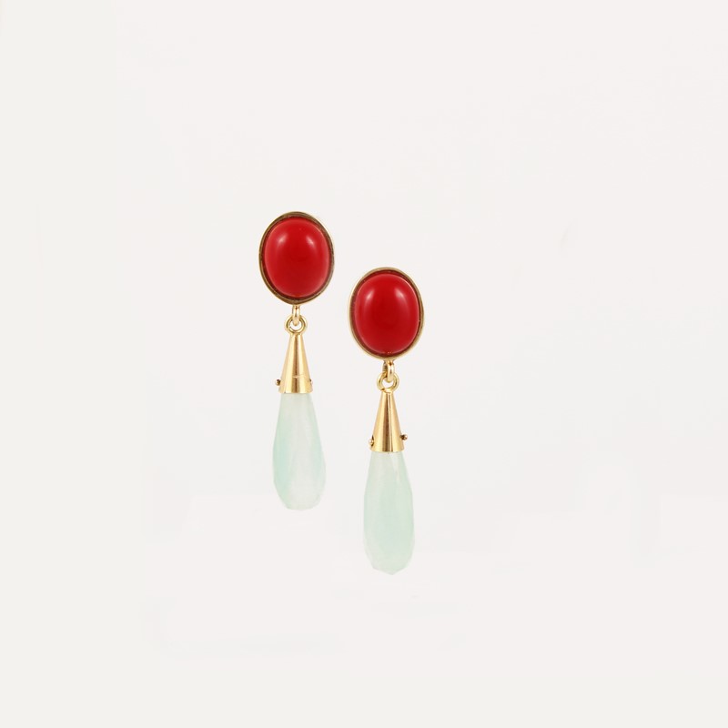 in oro giallo con opale taglio briolette e cabochon sintetico ad imitazione del corallo, gr. 7,7.