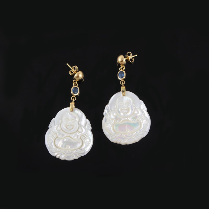 in oro giallo pendenti in madreperla incisa con riproduzione di Buddha e piccoli zaffiri, gr. 15,5.