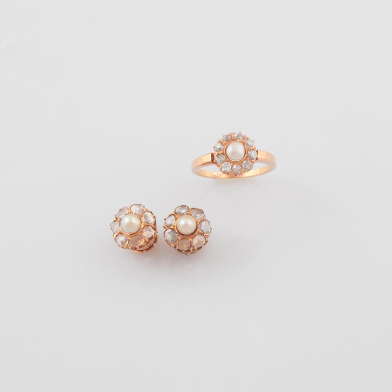 di anello e orecchini in oro giallo con perla centrale contornata da diamanti a rosa, gr. 8,1. Anello: misura 18 Inizio del XX secolo