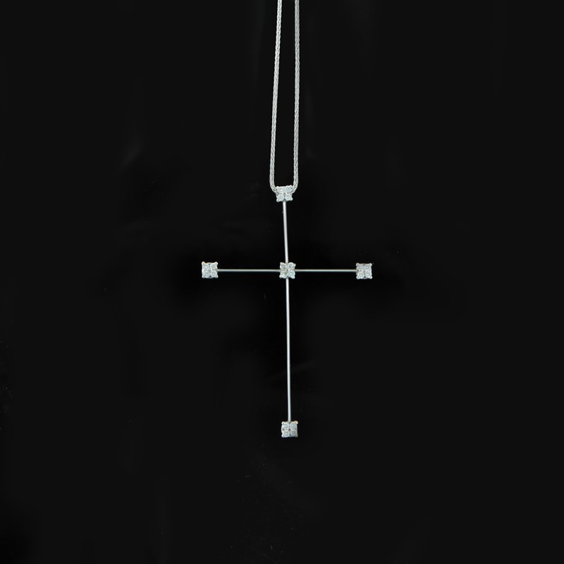 in oro bianco a forma di croce con brillanti, con catenina gr. 6,1.