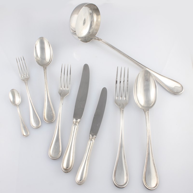 in argento 800, composto da 75 pezzi, gr. 2850 ca. (Esclusi i coltelli) Ditta Argenterie Greggio S.p.a Padova Numerario “100 PD”