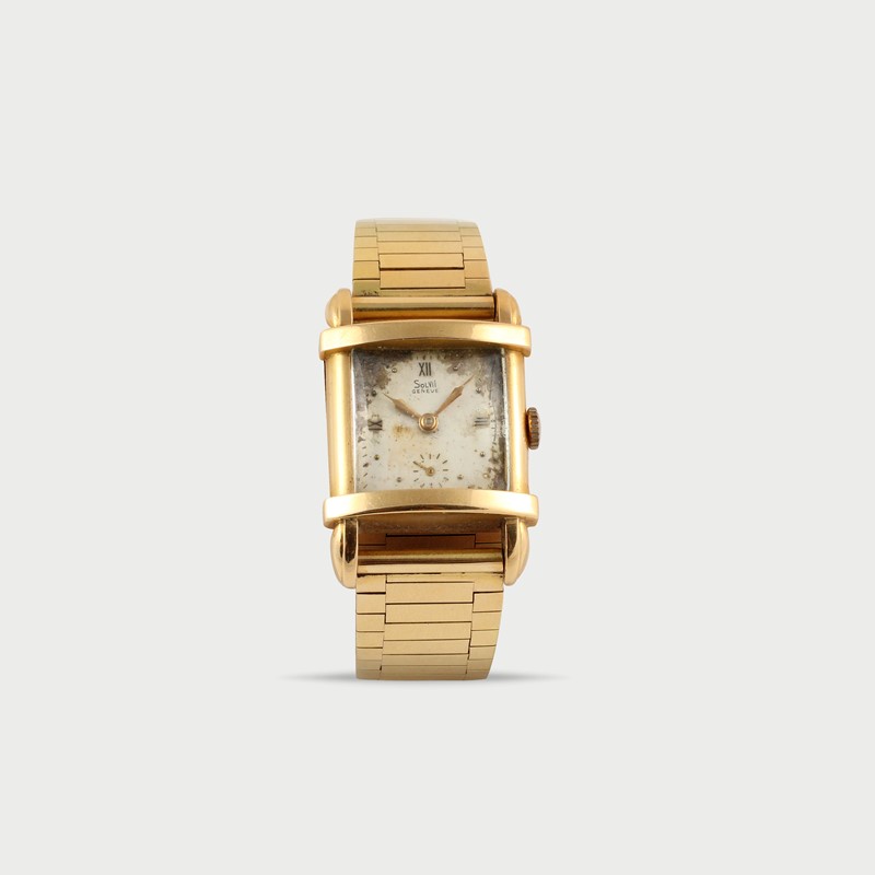Orologio da polso, di forma, in oro giallo 18Kt con bracciale in oro Dimensioni: 24 x 37 mm Quadrante con difetti Gr: 55.8