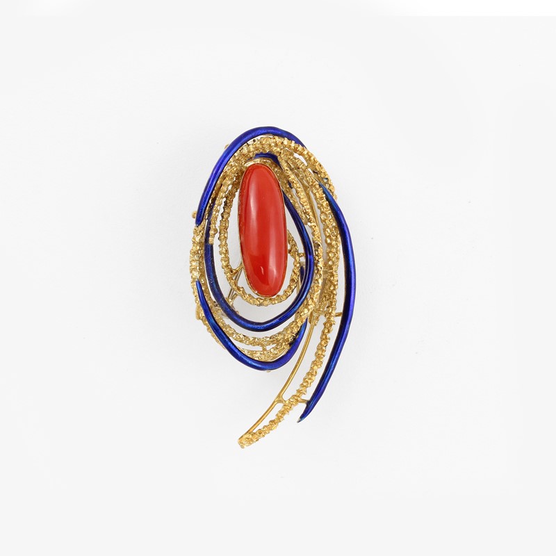 in oro giallo a forma elicoidale con smalto blu e corallo cabochon centrale, gr. 19,6.