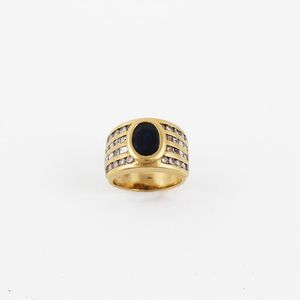 a fascia in oro giallo con zaffiro ovale affiancato da brillanti e diamanti carré incastonati. Diamanti del peso [..]