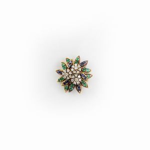 in oro giallo a motivi floreali, con brillanti, zaffiri e smeraldi, gr. 10.8.