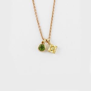 in oro rosa con gemma sintetica gialla taglio radiant e olivina (peridot) montati in oro giallo, gr. 14,4. Lunghezza [..]