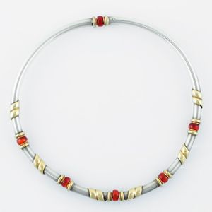 a girocollo in oro giallo con perle, smeraldi, zaffiri e rubini, gr. 14,1.