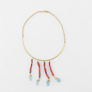 girocollo in oro giallo con corallo tubolare, iolite e acquamarina taglio briolette, gr. 34,1.