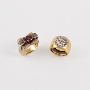 di due anelli, in oro giallo e argento, con diamanti taglio a rosa e rubino, gr. 21,1.