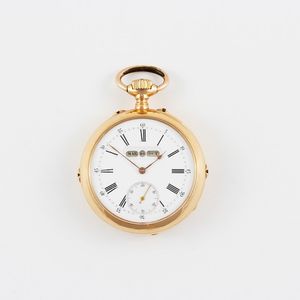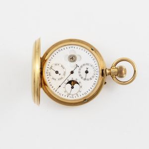 Orologio da tasca in oro giallo 18K, con fasi lunari e triplo calendario Realizzato nel 1900 circa Diametro: [..]