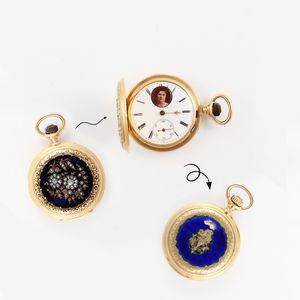 Orologio da tasca in oro giallo 18Kt e smalti con brillanti Diametro: 39 mm Smalti con difetti