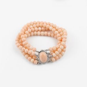 a quattro fili con sfere di corallo rosa, chiusura in oro bianco con corallo cabochon, 6,5 mm, gr. 54,6. Lunghezza [..]