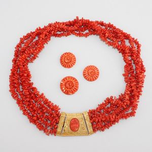 in corallo costituito da una collana girocollo a cinque fili di rametti e da tre cammei tondi privi di montatura [..]