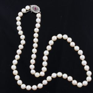 a un filo di perle coltivate, chiusura in oro bianco con rubino, 7,5 mm, gr. 45,3. Lunghezza 53 cm