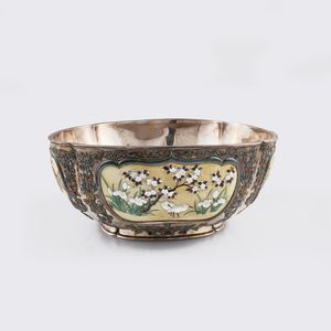 in argento a titolo alto, corpo ovale lobato, bordo alto decorato con volute a soggetto floreale e smalti policromi, [..]