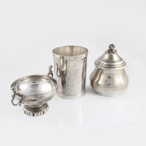 in argento a titoli vari, zuccheriera, coppa e bicchiere, gr. 570 ca.