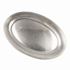 in argento, di forma ovale, bordato a palmette. 46x36 cm, gr. 1150 ca. Manifattura Italiana