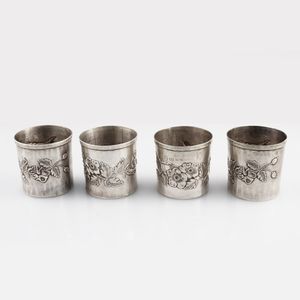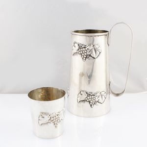 in argento, composto da brocca, motivi vegetali sbalzati e sei bicchieri con gli stessi motivi. Altezza 19 cm [..]