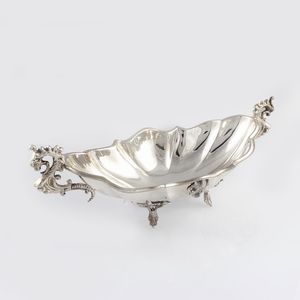 in argento, “3 VC”, a barchetta con piedini a motivi vegetali e manici “cavallucci marini”, dimensioni 26x16x8 [..]