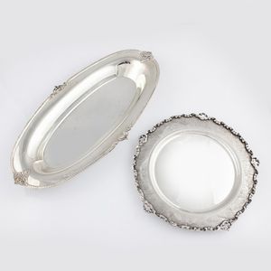 in argento, un piccolo piatto a bordo satinato inciso e da un vassoio ovale, fondo a specchio bordato a palmette. [..]