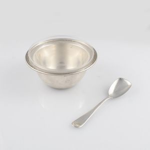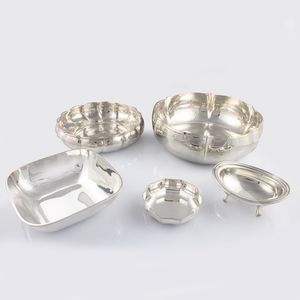in argento, due ciotole tonde con bordo baccellato, una quadrata, una ovale con piedini e una di forma ottagonale, [..]