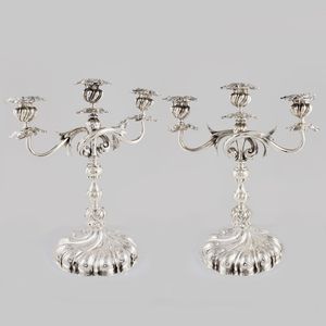 in argento 800, a tre luci, con fusto a tre lobi cesellati, due bracci a motivi vegetali, piede circolare baccellato [..]
