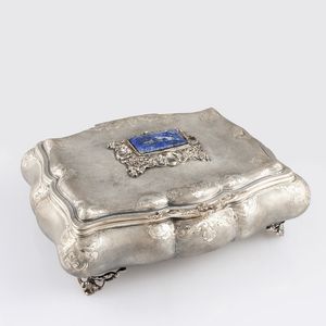 in argento 800, forma rettangolare bombata e sul coperchio riporto di cornice cesellata con lapis rettangolare [..]