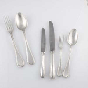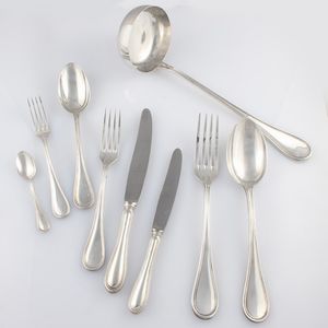 in argento 800, composto da 75 pezzi, gr. 2850 ca. (Esclusi i coltelli) Ditta Argenterie Greggio S.p.a Padova [..]