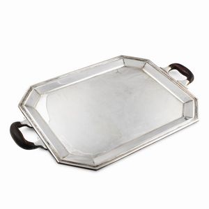 in argento 800, a forma rettangolare ad angoli smussati, bordo gradinato, con manici in legno, gr. 2400 ca. Dimensioni [..]