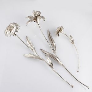 in argento 925, riproduzione di giglio, margherita e “anemone”, gr. 240 ca. Numerario 615 FI Firmato: Lisi – [..]