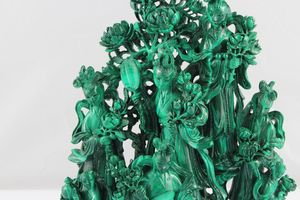 in malachite finemente incisa rappresentante un gruppo di sei “Quan-in” con fiori e ventagli. Altezza 21,5 cm