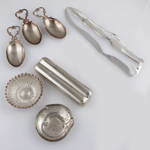 di sette oggetti in argento 925 e 800, di tre cucchiaini, due portaceneri, un portasigari e un fermacarte, gr. [..]