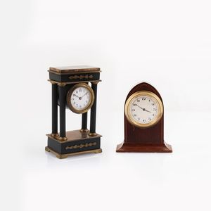 di due piccoli orologi da scrivania a carica manuale, in bronzo e legno, inizio del XX secolo. Diametro: alt. [..]