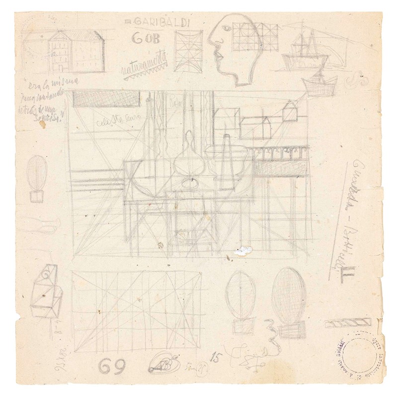 Foglio di studi: Natura morta, con altri disegni e scritte