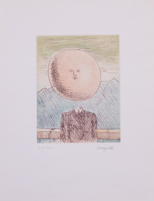 Acquaforte e acquatinta, es. 60/150, cm. 14x11 (lastra), cm. 28x22,4 (carta) (1969) Firma a matita sul margine in basso a destra: Magritte, tiratura in basso a sinistra: 60/150, timbro a secco in basso a destra: Gravure Originale / Atelier / René Magritte.