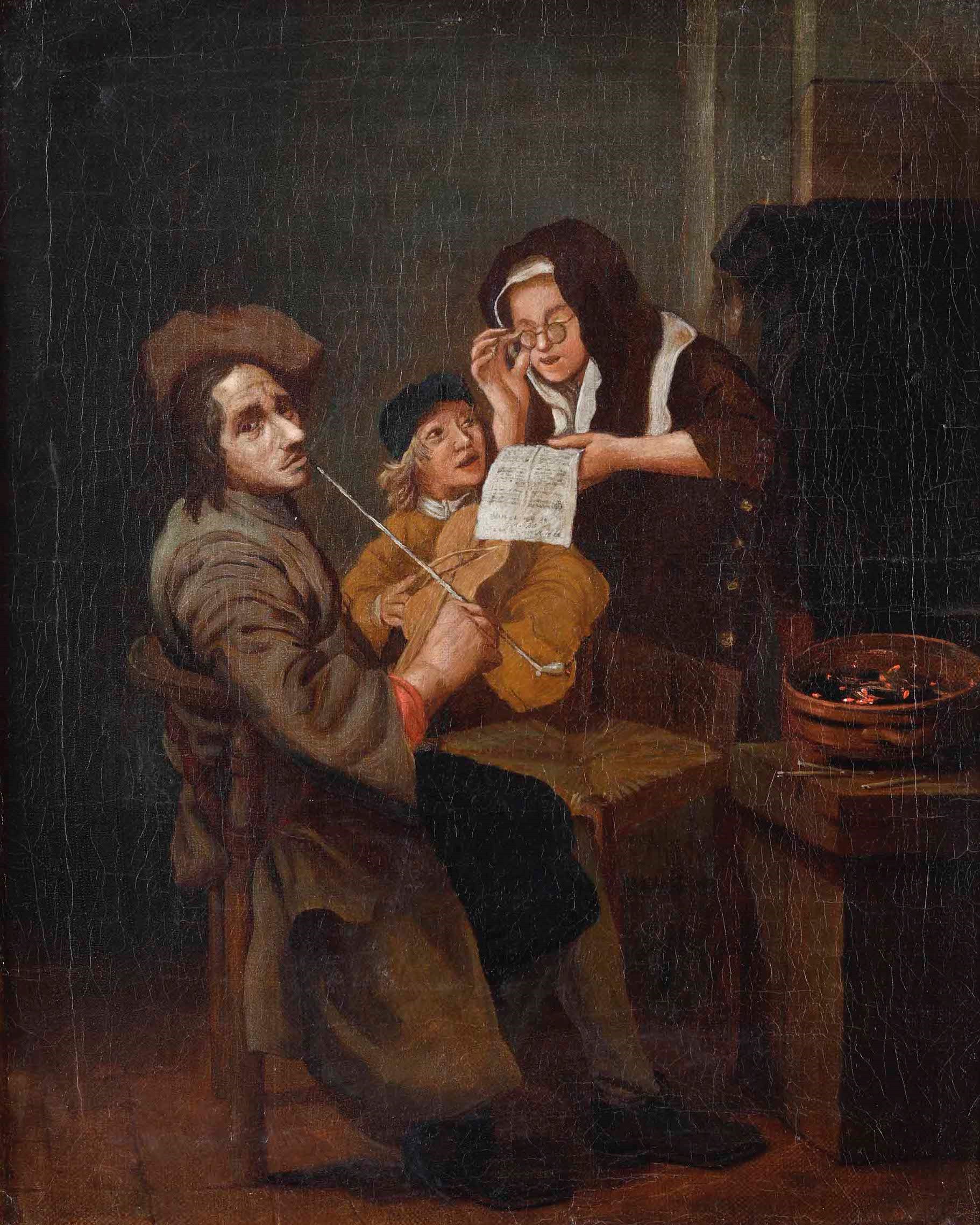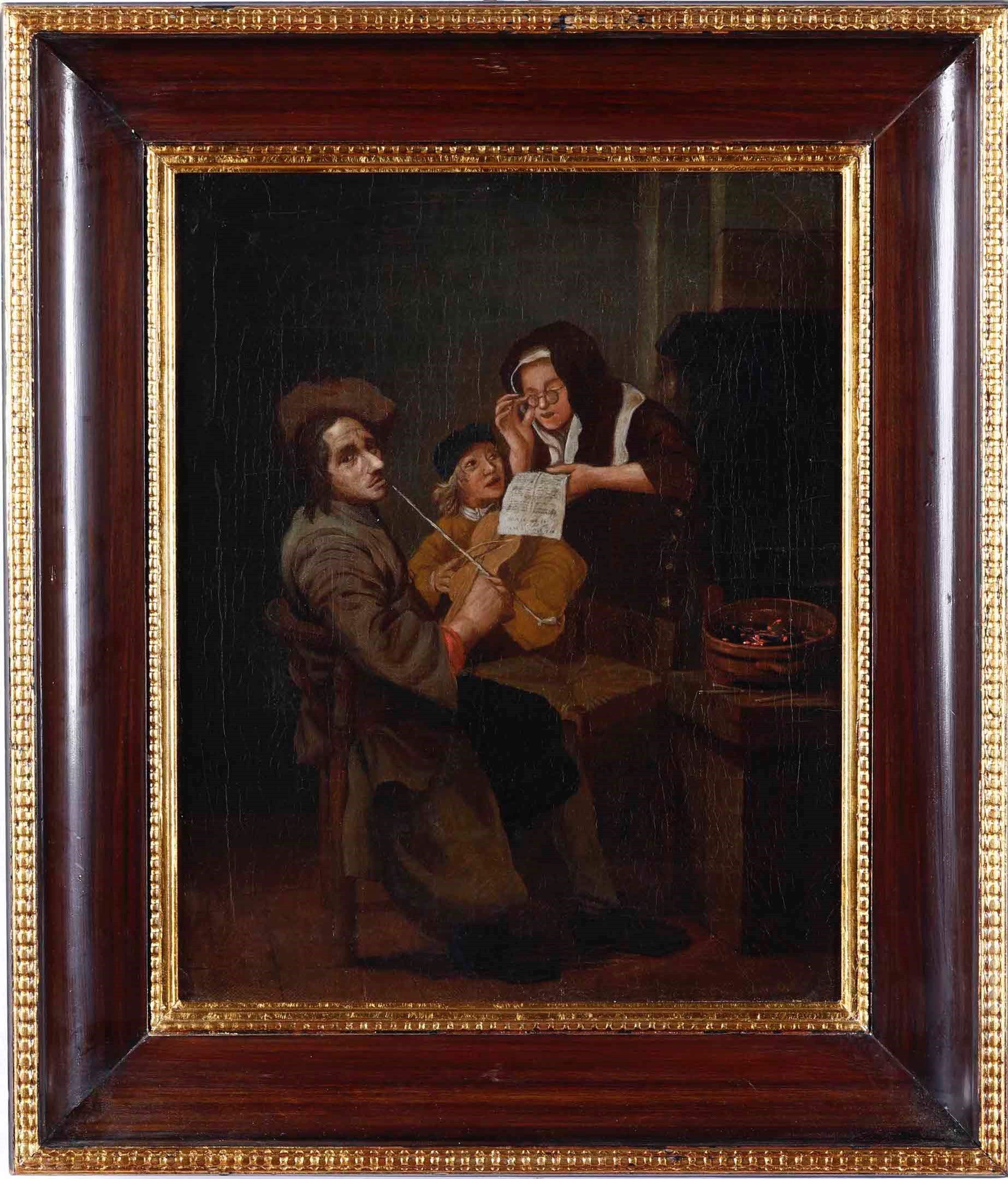 Scuola fiamminga del XVIII secolo Interno con fumatore, donna che legge una lettera [..]