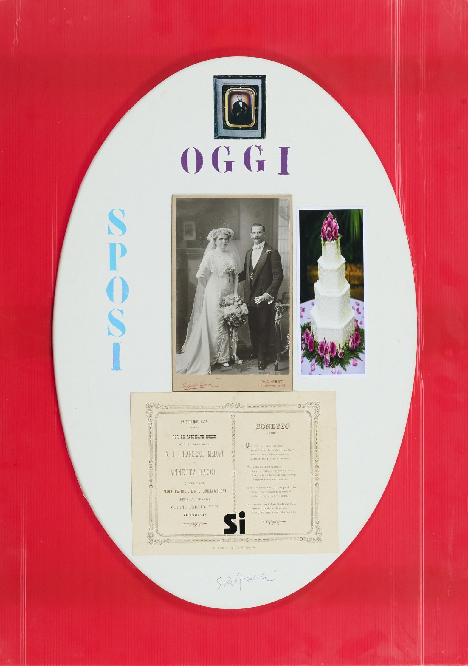 Tecnica mista e collage su tela ovale di cm. 60x40, applicata su pannello di plastica di cm. 73x52,5