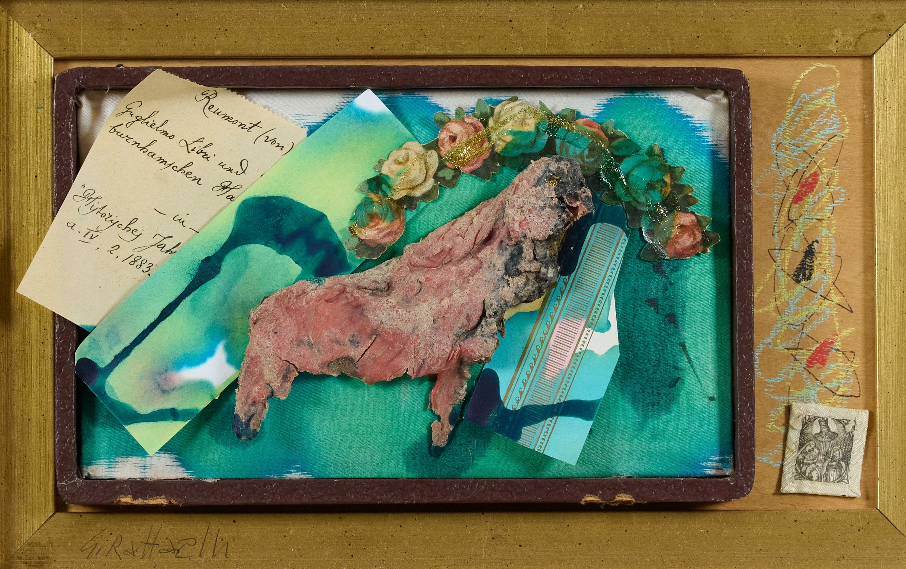 Tecnica mista e applicazioni su tavola, cm. 19x31 in cornice d'Artista,