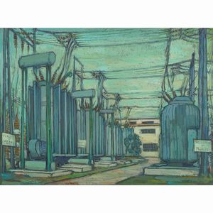 50x70 cm. Italia XX Sec. Stazione di trasformazione della centrale di Chivasso, tempera su cartoncino, firmato [..]