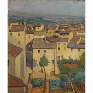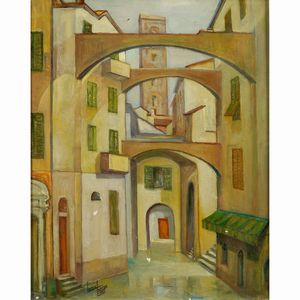 50x40 cm. Italia XX Sec. Scorcio di paese, 1987, olio su tela, firmato e datato in basso a sinistra, alcune cadute [..]