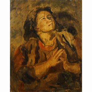 68x54 cm. Italia XX Sec. Donna in preghiera, olio su tavola, firmato in basso a destra